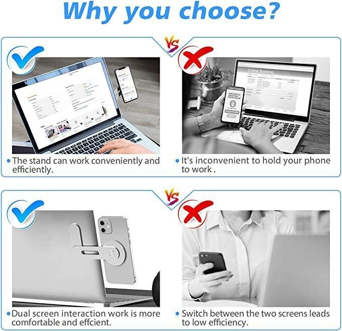 حامل هاتف مغناطيسي سهل التثبيت وخفيف الوزن، سيسمح لك بأداء مهام متعددة بسهولة بين هاتفك وجهاز الكمبيوتر المحمول، ويمكنك أيضاً تدوير هاتفك بزاوية مناسبة.