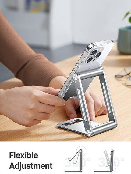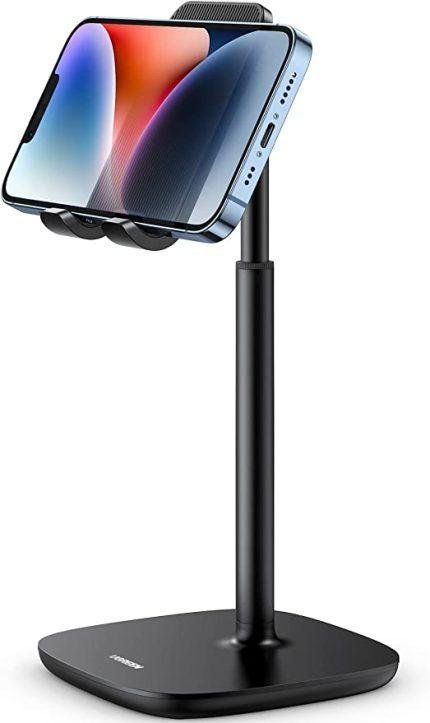 حامل للجوال بارتفاع قابل للتعديل يُستخدم لدعم الهواتف الذكية أو الأجهزة اللوحية بطريقة تجعلها مرتفعة على سطح مستوٍ. يتميز بإمكانية تعديل ارتفاعه وزاويته.